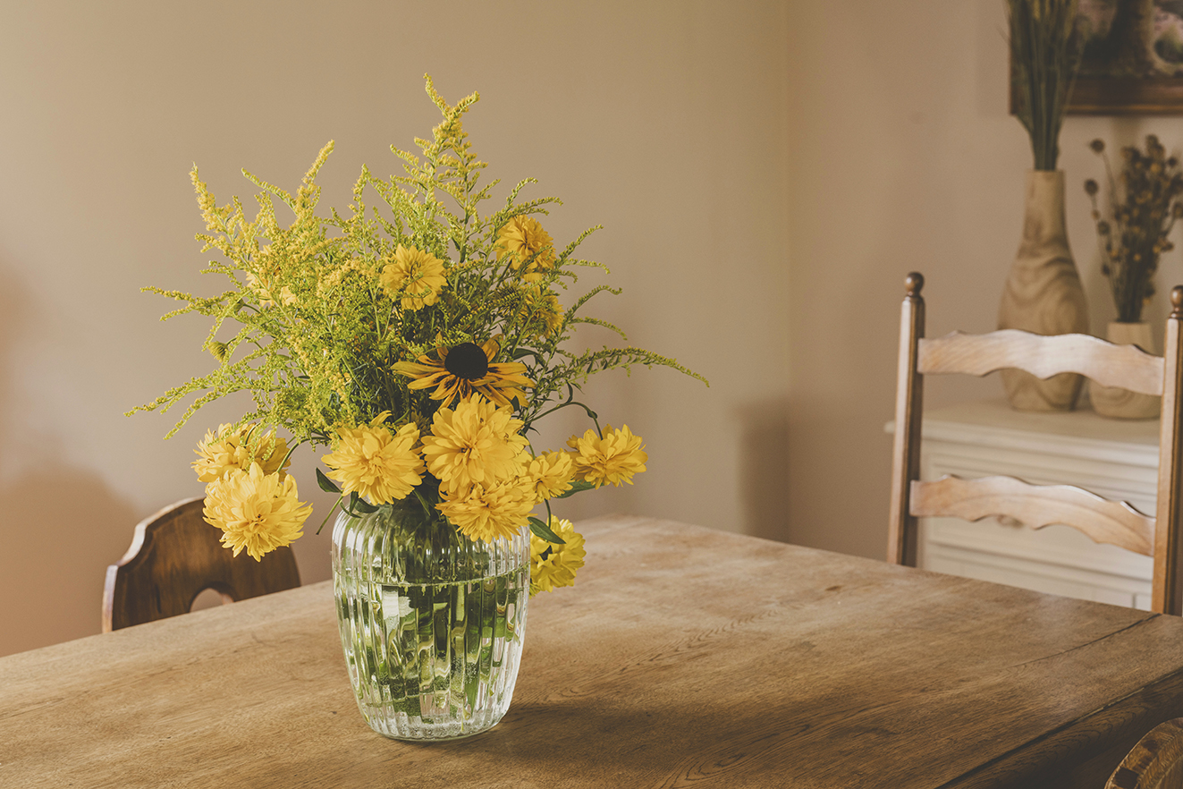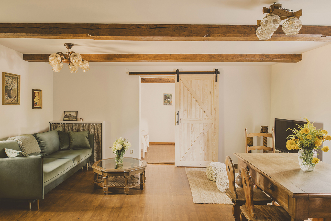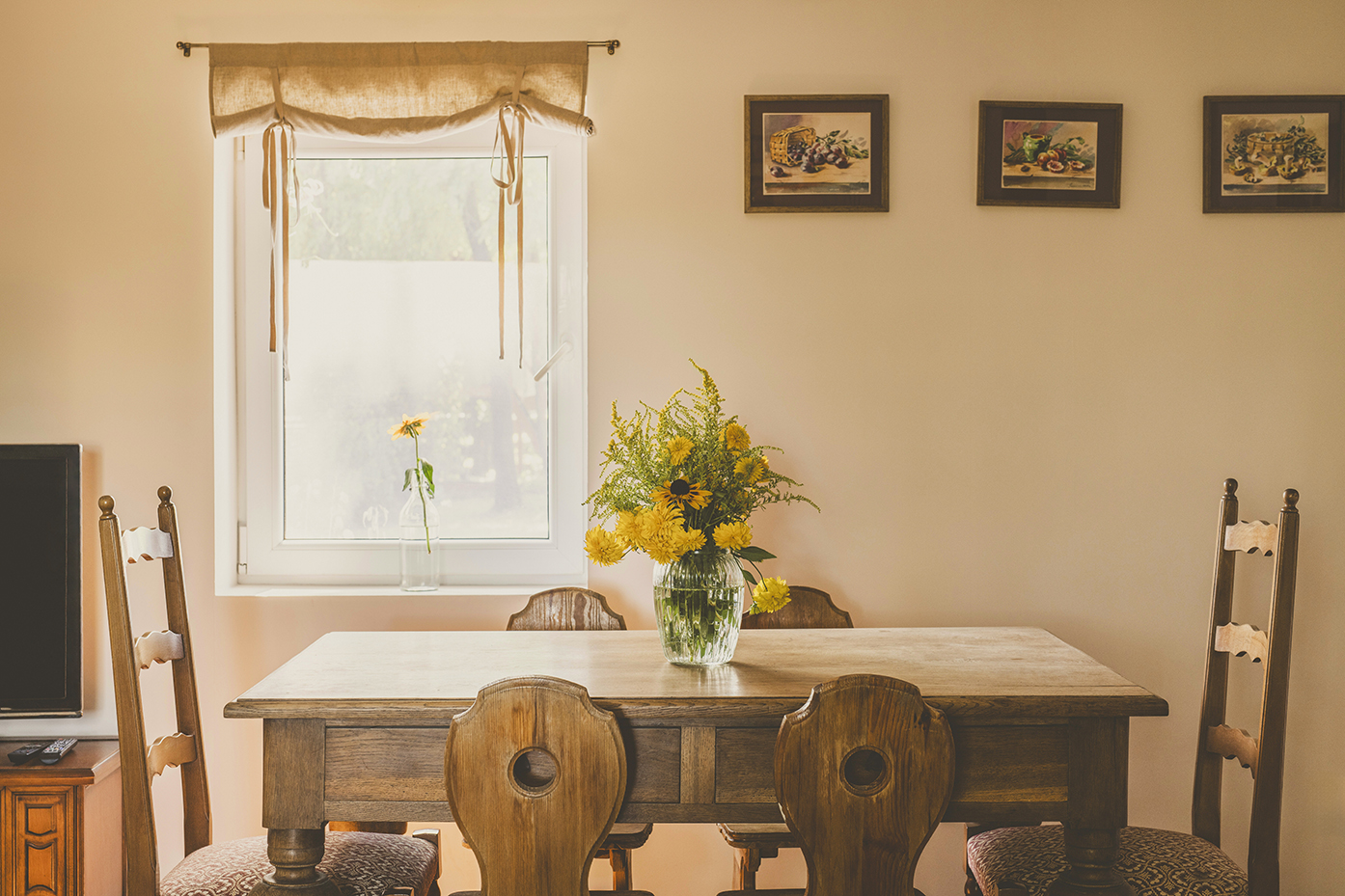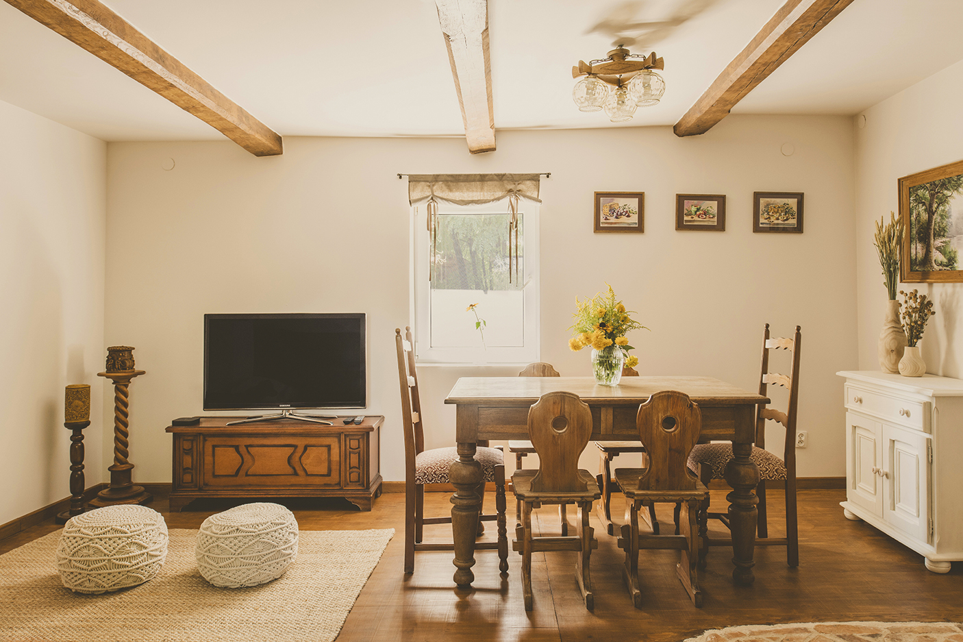 Duży, dębowy stół w salonie pomieści wygodnie 6 osób - idealny na wspólne posiłki czy wieczorne gry w planszówki.