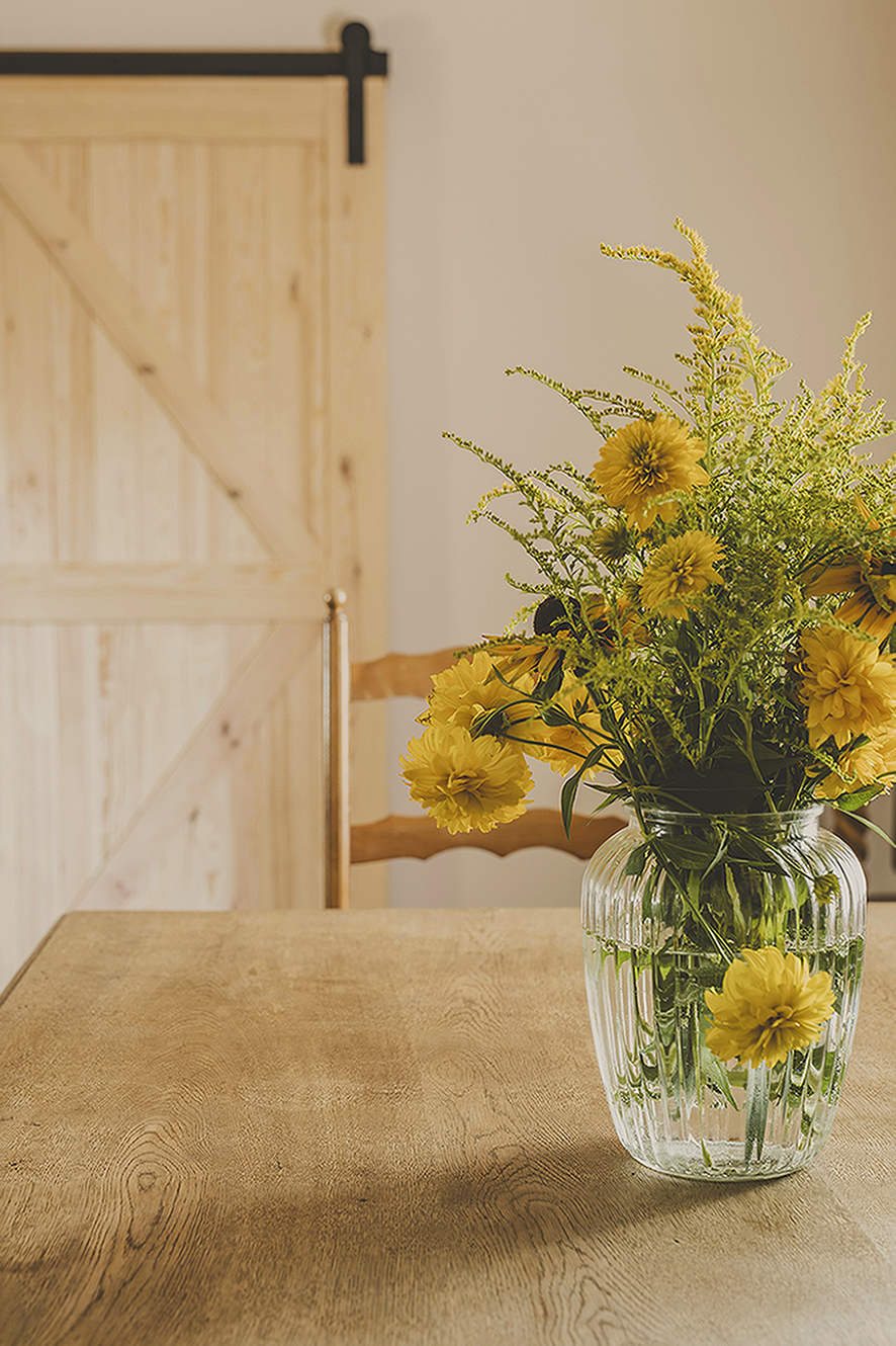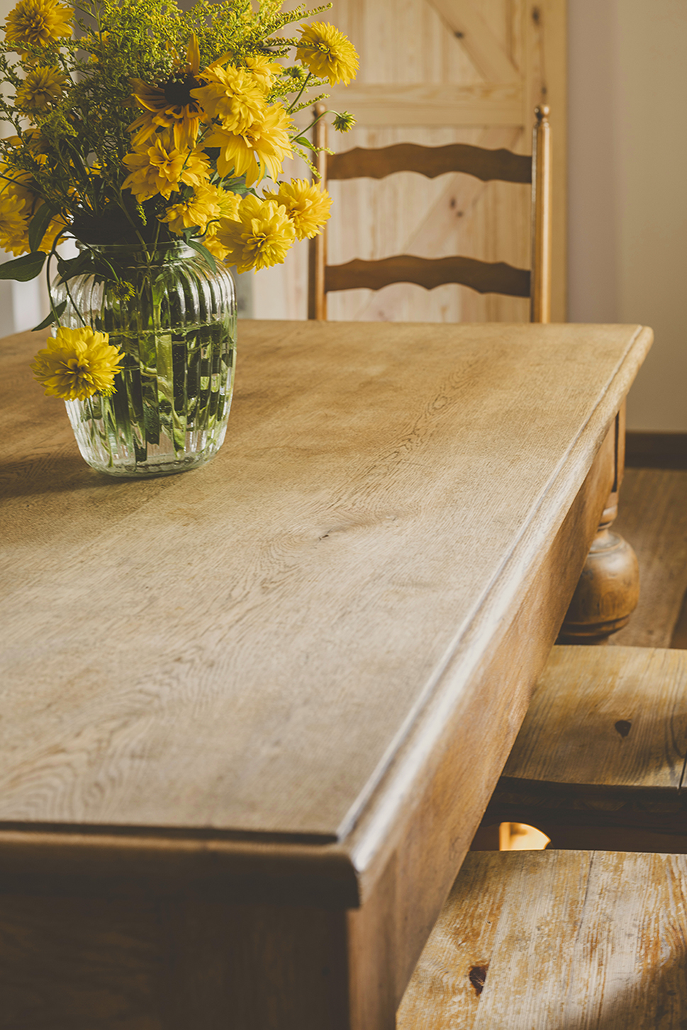 Duży, dębowy stół w salonie pomieści wygodnie 6 osób - idealny na wspólne posiłki czy wieczorne gry w planszówki.